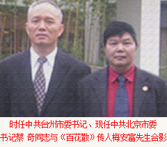 梅安富先生軍人出身(曾經在中國馬蘭核試驗基地工作十多年,為核武器發展做出了卓越貢獻、被評為八級軍殘)、高級經濟師、中共優秀黨員、天臺山人氏,F任中共鄭州臺州商會支部委員會書記、常務副會長兼秘書長、河南省保健品協會副會長、全國政協副主席、中共中央委員、中國殘聯主席鄧樸方先生與鄭州臺州商會支部書記兼秘書長、《百花散》傳人梅安富先生親切交談鄭州市腫瘤康復協會名譽會長。2005年5月,作為臺州古代中醫秘方梅氏《百花散》